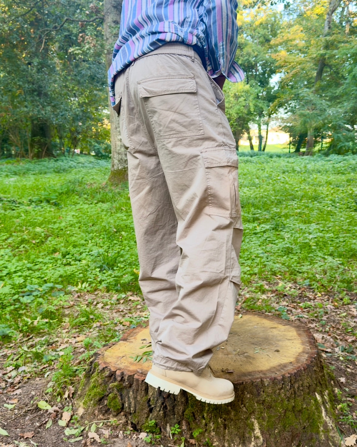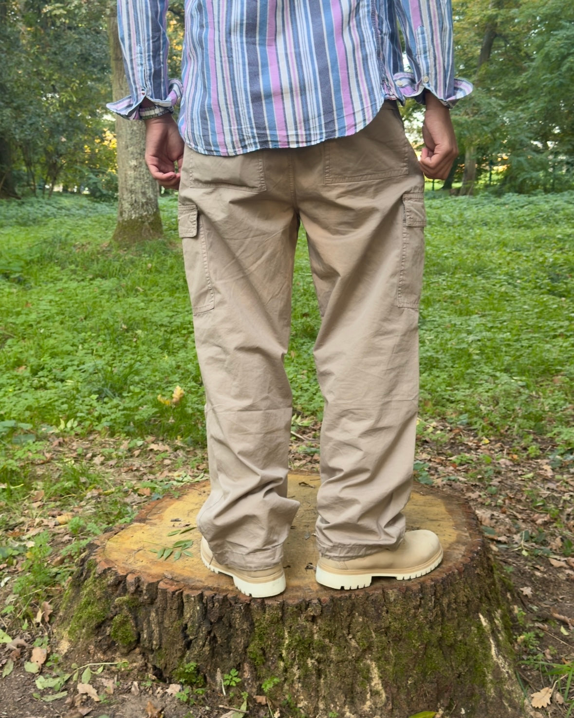 These cargos feature a regular-to-baggy fit inspired by classic American workwear. Designed with back pockets, functional knee-level pockets, and two pleated stitch details below the knees for added character. Made from 100% cotton, they offer both comfort and structure — perfect for streetwear looks or laid-back casual outfits.