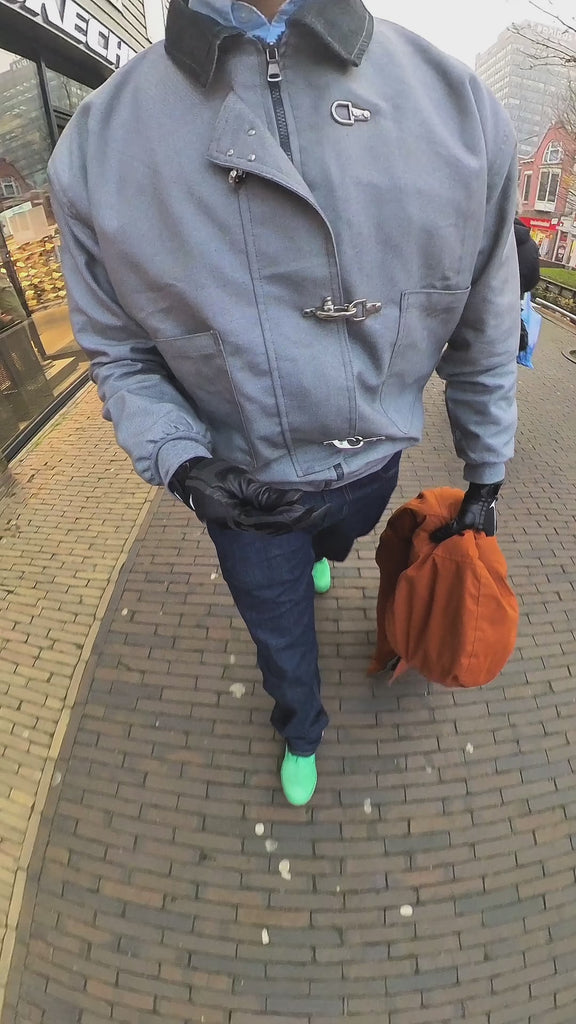 This jacket features authentic fireman-style metal clasps, giving it a bold, utilitarian edge while ensuring secure fastening and standout character.