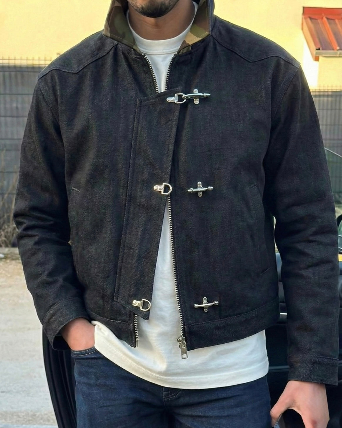 This jacket features authentic fireman-style metal clasps, giving it a bold, utilitarian edge while ensuring secure fastening and standout character.