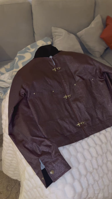 The fabric of this jacket has a glitter sparkling effect. please watch the fabric video on this item listing.