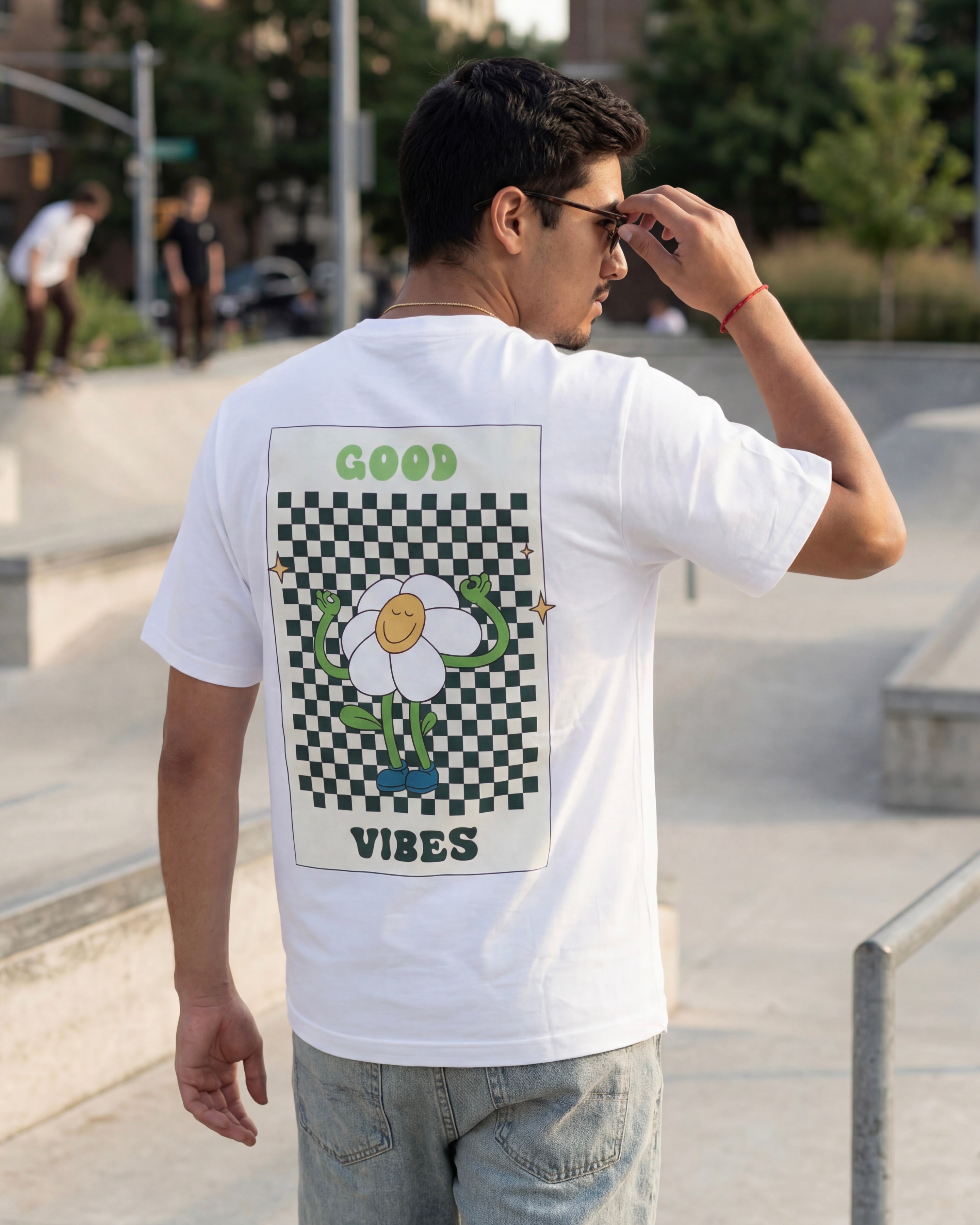 The large GOOD VIBES back graphic features a vibrant checkerboard pattern and playful flower design, printed using high-quality printing technology to deliver sharp colors and long-lasting detail.